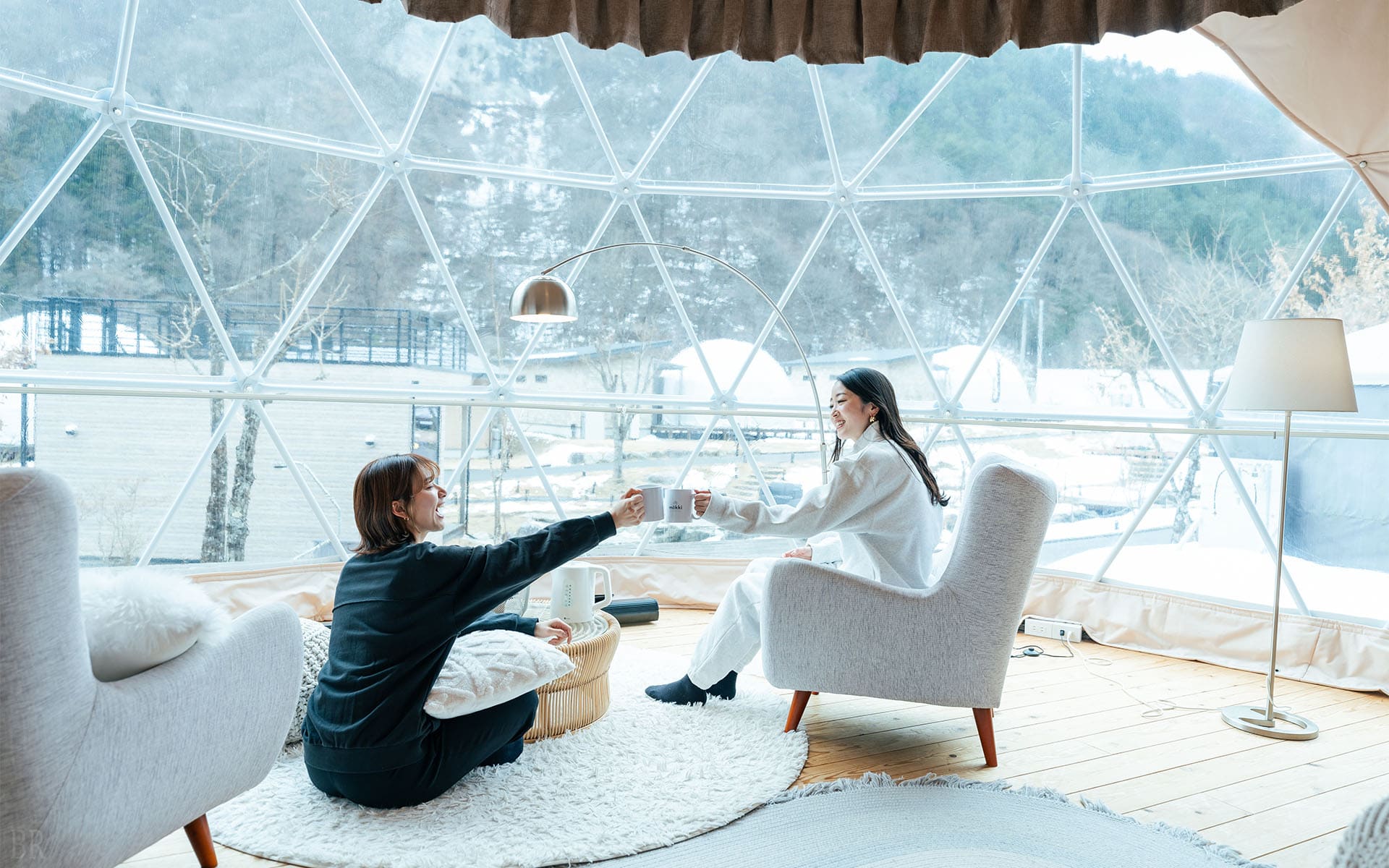 객실에서는 아치무라 지역에서 처음으로 숙박 가능한 대형 돔 텐트와, 반려견과 함께 머물 수 있는 코쿤 텐트, 그리고 2층으로 넓고 고급스러운 스위트 타입 빌라를 준비하고